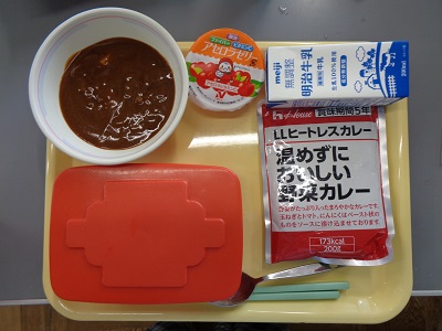 昨日のかん易給食は、ヒートレスカレーでしたね。温めなくてもおいしく食べられるというのは、とても便利ですね。しかも賞味期間が5年ですから、非常食にはぴったりです。みなさんの家には、こういった非常食は用意されているでしょうか。これを機会に確認してみてください。