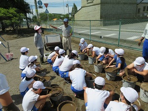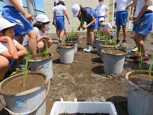 今日は、バケツに稲を植えました。これからの稲の成長が楽しみです。