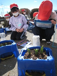 自分と違う花の球根を選んだ友達と見比べ合って、花によって芽の形や色の違うこと、同じチューリップでも芽の色合いが違うことに驚き、楽しんでいました。