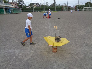 ドッチビーのディスクを使い、傘をカップに見たて、何打で入るかを競うものです。