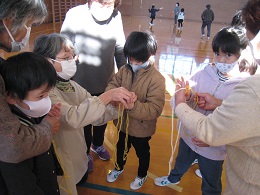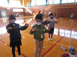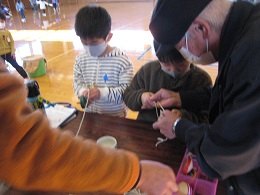 あやとり紐、お手玉3つ、竹とんぼ、ぶんぶんごまという「昔遊びセット」を用意していただき、丁寧に遊び方のこつを指南していただきました。ご多忙の中、大変ありがとうございました。