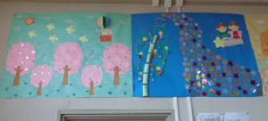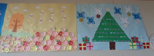 ②掲示物の作成 図書室の壁面に飾る掲示物を作っています。現在は新型コロナウイルス感染症予防の観点から、作るものを決めた後に、材料を持ち帰り自宅でパーツ作りなどの作業をしています。