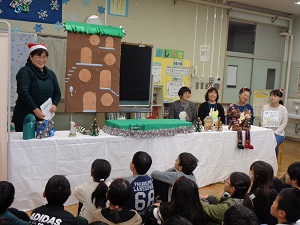 ③校内イベント 11~12月ごろにペープサート(紙人形劇)などを行います。ちょっとした仮装なども取り入れ、子供たちが楽しめるように工夫しています。