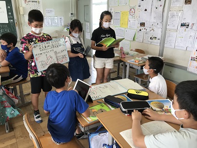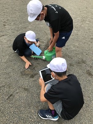 水の流れている様子をタブレットで撮影し、その後教室で結果について友達へ説明しました。
