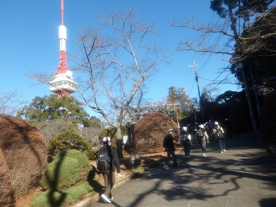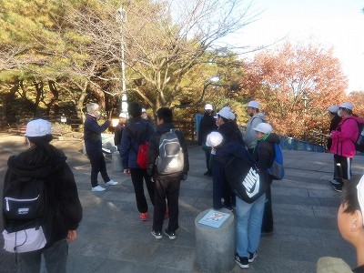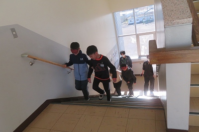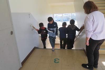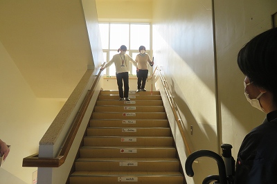 階段の上り下りの誘導のお手本を見せてもらい、3年生もチャレンジしました。
