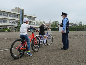 4年生が、西汗派出所の巡査さんから自転車の正しい乗り方を教えていただきました。校庭に作った摸擬道路を使って、交差点での安全確認や横断歩道の渡り方など、一人一人練習をしました。最後に巡査さんから、「安全に気を付けて自転車に乗ってください」「免許皆伝です」とお話をいただき、子供たちはとても嬉しそうでした。これで、より広い範囲を自転車に乗ることができますね。