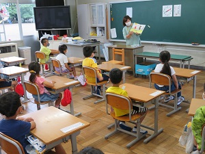 図書ボランティアの皆様による読み聞かせが行われました。「密」を避けるため、通常より間隔をとっての読み聞かせでしたが、子供たちは皆熱心にお話に聞き入っていました。とてもすてきな時間となりました。