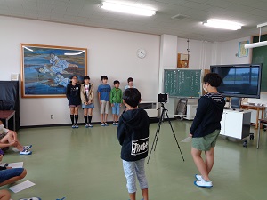業間にZoomを使った縦割り班紹介を行いました。6年生が視聴覚室に集まり、そこから配信して、各教室でテレビを観ての紹介となりました。