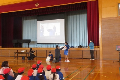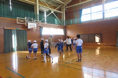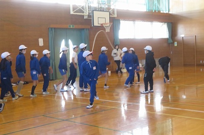 階段の上り下りの誘導のお手本を見せてもらい、3年生もチャレンジしました。