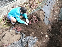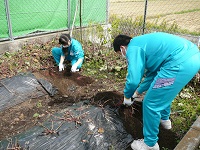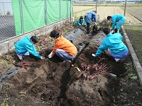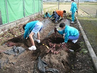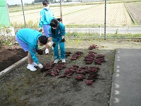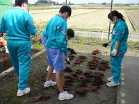 今日は、3時間目に6月に植え付けをしたサツマイモ(品種:「紅はるか」)の収穫をしました。これまで、畝づくり、マルチシートはり、つる返し、除草等々、頑張って世話をしてきました。生徒たちは、思っていたよりも大きく育ったサツマイモに歓声をあげていました。ちなみに、「紅はるか」は、繊維質が多めでしっとりと甘いのが特徴なんだそうです。ただ、収穫直後は、主成分である炭水化物のほとんどがデンプンであるためあまり甘くありません。3~4週間保存すると、デンプンが果糖などの糖類に変化して甘くなります。