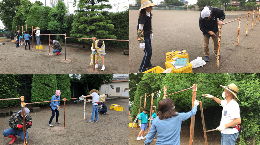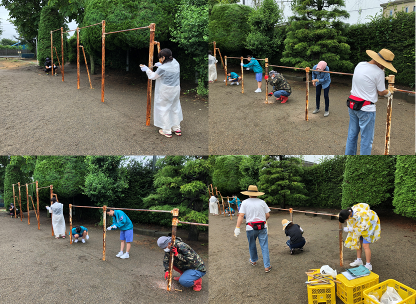 6月29日8時30分より、校庭鉄棒ペンキ塗りに向けて、サビ落としから始めました。