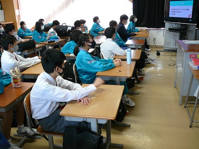 本日5校時終了後、リモートによる「生徒集会」を実施しました。今回は、生徒会本部から「あいさつ運動」「アルミ缶回収」「ベルマーク運動」についての説明がありました。ご協力よろしくお願いします。