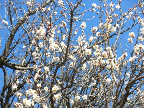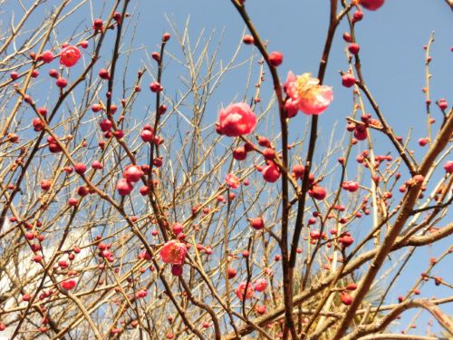 この季節は、駐輪場に入る手前の倉庫の近くから、甘い香りが漂ってきます。今年も季節を忘れずに「紅梅」「白梅」が一輪一輪と花を咲かせています。