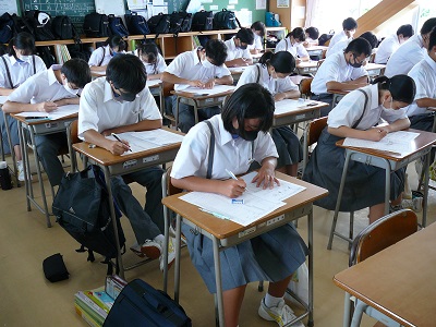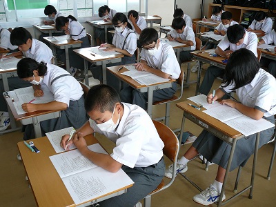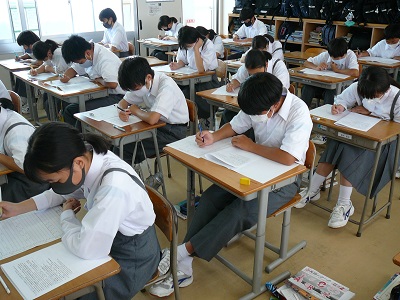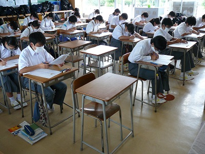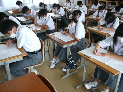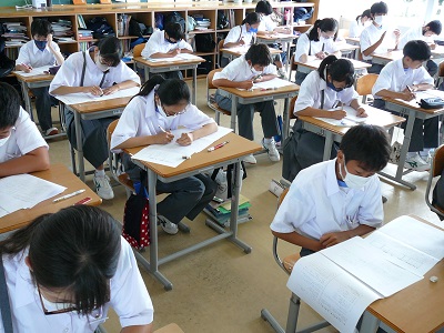 第1学期中間テスト1日目です。各学年とも、生徒たちは3教科の試験に臨みました。1年生にとっては、中学校に入学して初めての定期テストです。小学校の頃は、各教科とも単元終了後に単元テストを受けていましたので、きっと、勉強する範囲の広さに驚いたことでしょう。さて、私がまだ中学校の教員になりたての頃、ある先輩の先生にこんなことを言われたことがあります。「生徒の学力は、毎日授業の度に少しずつ上がっていくのが理想だけど、現実はそうじゃないんだ。定期テストの度にぐっと上がるんだ。だから、テストづくりに手を抜いたらだめだ。」もう、30年も前に先輩の先生からいただいた言葉ですが、定期テストがある度に思い出す言葉です。