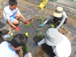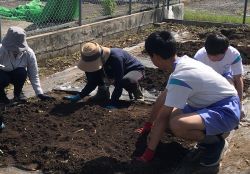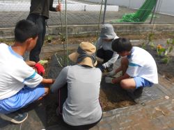 今年も2名の学校支援ボランティアの方々が、2年E組の農園の整備にきてくださいました。また、野菜の苗の植え方についても丁寧に教えてくださいました。今年は、どんな野菜が収穫できるのか楽しみです。