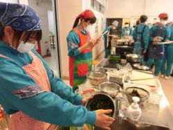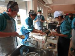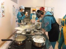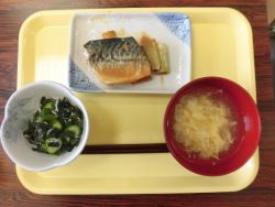 分量を正確に計り、時間をかけてじっくりと煮込んだ「鯖の味噌煮」は、とてもおいしかったので、保護者の皆様にも是非試食していただきたかったです。「鯖の味噌煮」「かき玉汁」「わかめの酢の物」の3品。バランスのとれた基本的な和食ですので、ぜひ休日お子様と一緒に家庭でも作ってみてください。