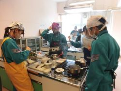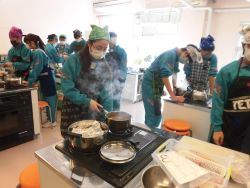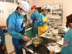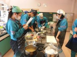 3月1日(金)に2年B組が2・3校時に調理実習を行いました。廊下には、鰹と昆布のだしのよい香りが漂っていました。体育の授業を終え、体育館から戻ってくる1年生の生徒は、