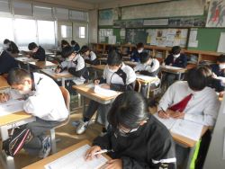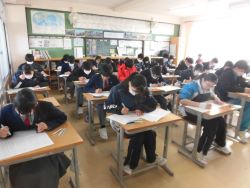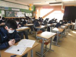 今日から1、2年生の期末テストが始まりました。登校すると、着席してテスト範囲の復習をしている生徒もいて、いつもより緊張感のある空気がありました。3年生は、これから県立の一般選抜試験になります。1,2年生は、1回1回の定期テストが、受検の練習だと思って心構えや問題を解く時間配分などを考えて臨んでほしいです。