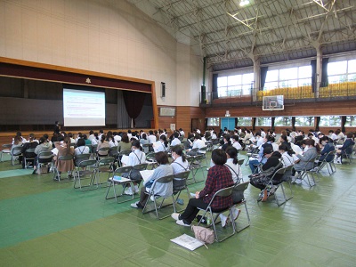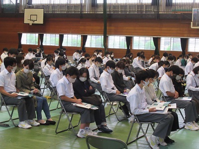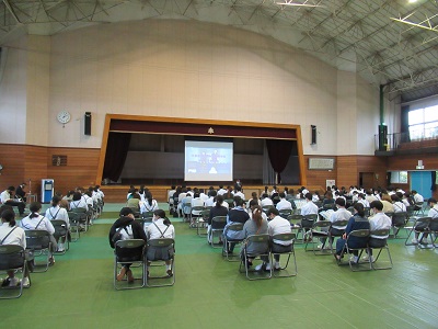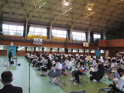 先週の金曜日に、本校体育館で【私立高等学校説明会】を実施しました。台風16号の影響で風雨の強まる中でしたが、たくさんの3年生の保護者の皆さんに来校していただきました。ありがとうございました。説明会では、それぞれの私立高等学校の担当の先生に、教育活動の特色や高等学校卒業後の進路先等について丁寧に説明していただきました。私立高等学校の出願まで2ヶ月を切り、3年生はいよいよ受験態勢に入ります。生徒も保護者の皆さんも、各高等学校の先生の話を真剣に聴いていました。私からは、「決して焦らず、じっくり学習に取り組むことが、希望進路の実現に向けての最良の選択です」といった話をさせていただきました。