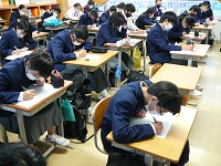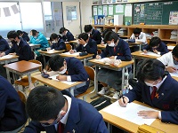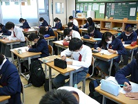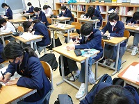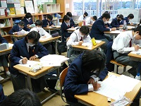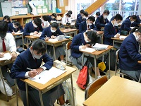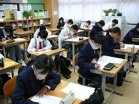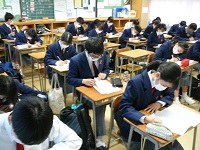 いよいよ明後日から第2学期中間テストが始まります。今日は、6時間目終了後に、【学びの時間】を実施しました。この時間は、定期テスト対策に特化した時間で、10年以上前から実施している本校の伝統ともいえる時間です。生徒の作成した予想問題を解いた後、自分の解答と問題作成者のつくった解答や解説とを比較することで、現在の自分の弱点を知り、教員に質問をしたり、今後の学習の重点項目を設定したりします。さすが、本中生、みんな真剣に問題に取り組んでいました。