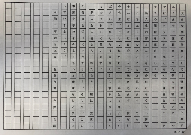 本日の朝の放送で、生徒会長の今井君が放送で、「新入生歓迎の言葉」を行いました。終了後、各教室から拍手が起こりました。