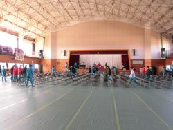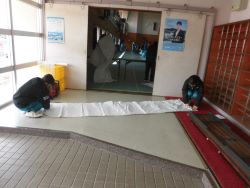 3,4校時に2年生が卒業式の事前準備を体育館で行いました。シート貼り、机や椅子並べ、ストーブの準備など各自が分担された役割を協力して行いました。