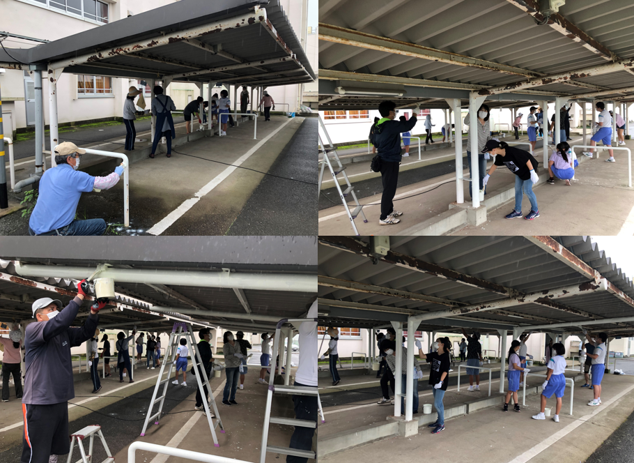 7月18日に自転車置き場のペンキ塗りを行いました。学校支援コーディネーターが呼びかけを行い、学校運営協議会の皆様や保護者の皆様と生徒や教員も参加し27名で行いました。1時間の作業でしたが大変綺麗になりました。塗り残しについては後日参加者を募集しますのでよろしくお願い致します。