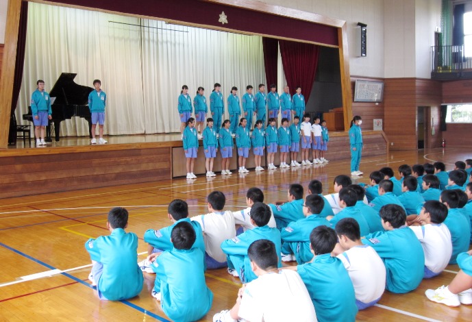 10月18日(水)、音楽集会が開かれました。来週に迫った合唱コンクールに向けて、入退場の説明等があり、その後、全校生徒で合唱の練習を行いました。