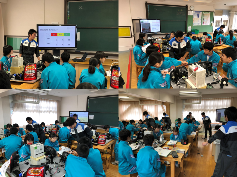 日産大学校の生徒が、機材を搬入し技術特別授業を行って下さいました。車の仕組みの回路模型を実際に準備して下さりました。生徒達も楽しくい行っていました。
