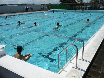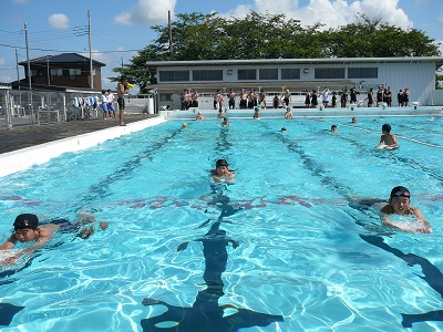 気温も上がり、1,2年生はプールでの水泳学習です。ビート板を使用して、平泳ぎの際、水中での推進力を効率的に上げるために必要な足の使い方について学習していました。