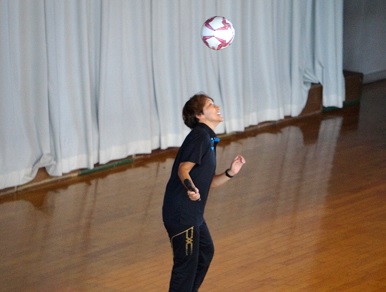 9月19日(水)、女子サッカー元日本代表選手で、とちぎ未来大使でいらっしゃる手塚貴子先生による「夢」講座が体育館で行われました。「夢に向かって」という演題で御講話を伺った後、サッカーボールを使った活動の御指導もしていただきました。