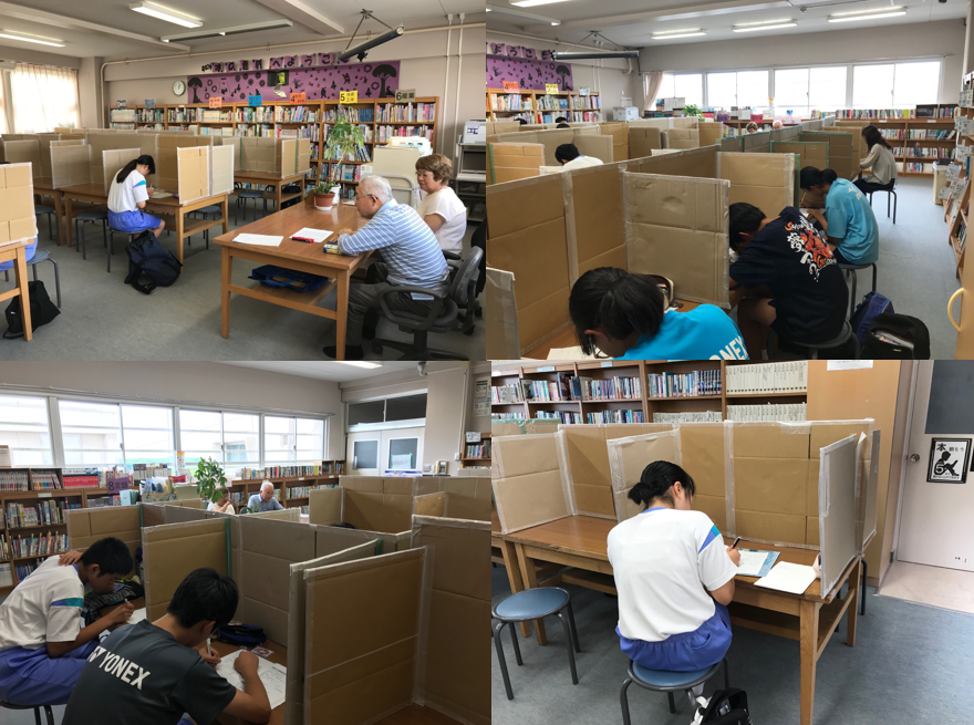 本郷中学校の図書室が、町の図書館の学習室のようになりました。仕切りをボランティアの方だ作ってくださり、図書室の見守りボランティアさんもいます。エアコンの効いた良い環境です。