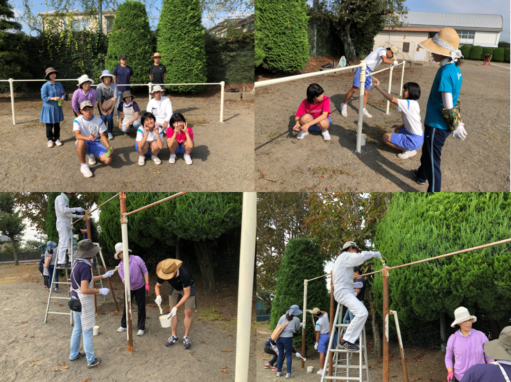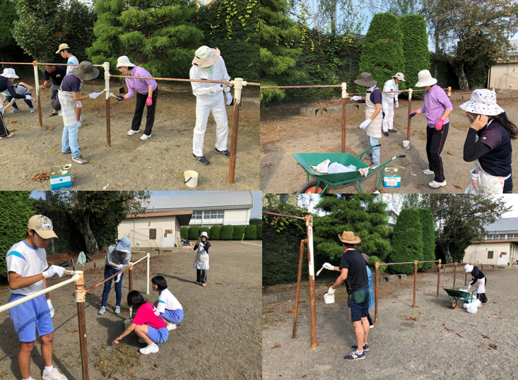 昨日、校庭の錆びた鉄棒のペンキ塗りを行いました。学校支援コーディネーターとボランティアの保護者の方、3年生の生徒3名が来て下さいました。おかげさまで鉄棒が綺麗になりました。ありがとうございました。