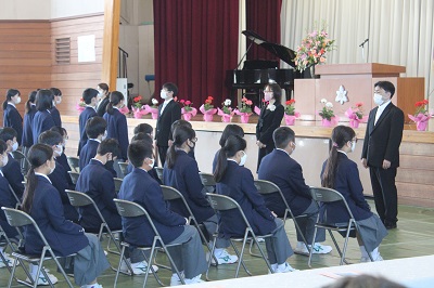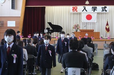 令和3年度入学式を実施しました。新型コロナウイルス感染症の感染拡大防止のため、在校生や来賓の方々の参加は見合わせていただきましたが、多くの保護者の方々に参加をしていただきました。また、74名の新入生たちは、少し緊張していた様子でしたが、担任から呼名されると皆元気に返事をしてくれました。入学式の式辞の中で、私からは次のような話をさせていただきました。