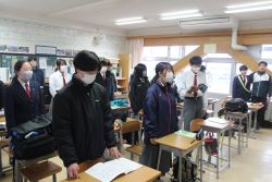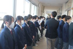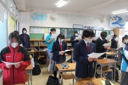卒業式まであとわずか。学校では、音楽の時間や帰りの会の前の時間を使って式歌の練習をしています。はじめは、自教室で練習をしていましたが、3年生は廊下に並んで声を出し、学校中に声を響かせていました。在校生は自分の歌声が、卒業生に届くようにと練習に励んでいました。学校だからこそみんなで1つになって作りあげる喜びが味わえるのだと思います。
