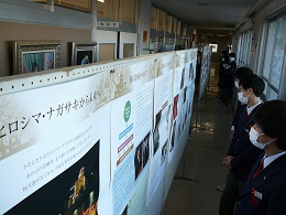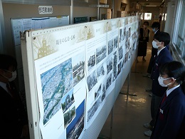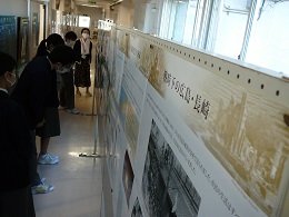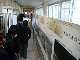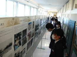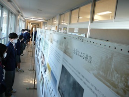 現在、本校職員室前廊下において、【原爆写真ポスター展】を開催しています。そこで、どのようなポスターが展示されているのか、一部紹介させていただきます。「被爆前の広島・長崎」「被爆直後の街の様子」「熱線による被害」「原爆の絵」「大混乱の中の救援活動」「街の再生と復興」「核兵器廃絶に向けて」等々、解説とともにたくさんの作品が展示されています。休み時間に見に来ている生徒、社会の授業中に教科担任の説明を聴きながらポスターに見入っている生徒、どの子の目も真剣そのものでした。
