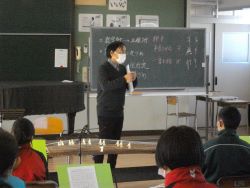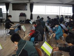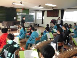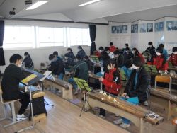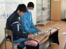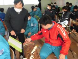 |        12月8日(金) 2年生の音楽で箏曲体験学習がありました。「中学校学習指導要領」には、日本の伝統的な音楽文化のよさに気づき、尊重しようとする態度を育成するために、実際に和楽器を活用した活動を通して、日本や郷土の伝統音楽を体験することが大切であるとして、3学年を通じて1種類以上を用いるようにすることが示されています。箏は、音を容易に出すことができる楽器であり、様々な奏法の工夫によっては、豊かな表現がしやすいという特徴があるそうです。今日は、指導をしてくださった専門の先生から基本奏法を教えていただいた上で、自分の思いやイメージを音にのせ、「さくら さくら」を演奏しました。 |