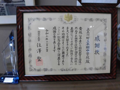 租税教育推進校 国税庁長官感謝状が授与されました!