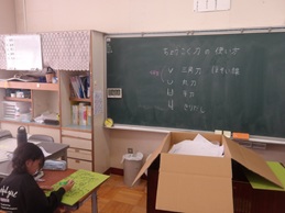 4年生は、初めて彫刻刀を使いました。今日は、彫刻刀の扱い方、使い方を学びました。安全に使えるように基礎・基本的なことを学びました。
