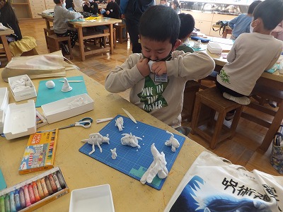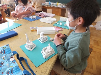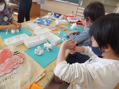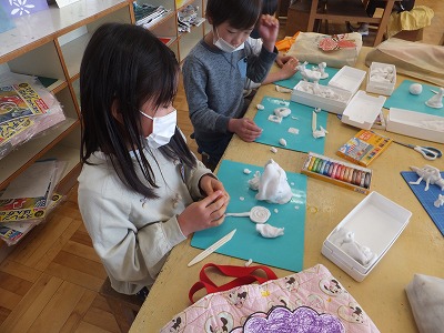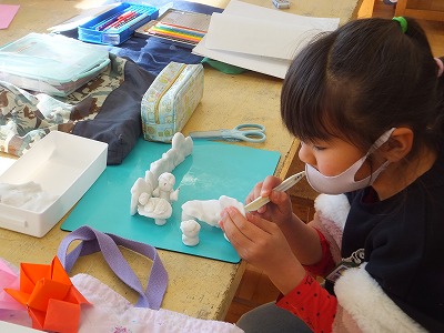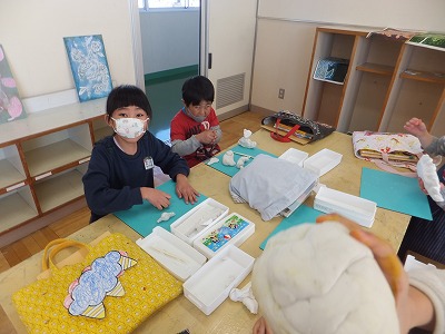 みんな上手に描けていますね。終わった子は、粘土遊びです。