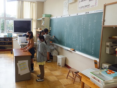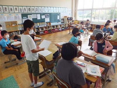 先日グループごとに考えた来年度の1年生への学校紹介について話し合っています。