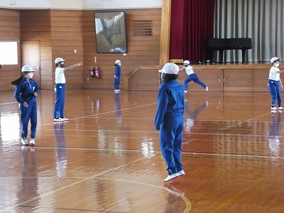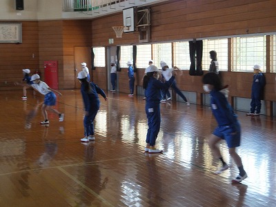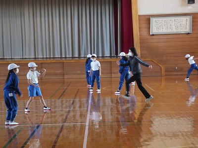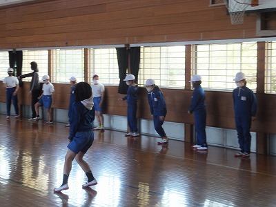 1組は体育館で、体つくりの運動をしました。柔軟運動をした後、昔からある、じゃんけんで勝ったら先に進むゲームをしました。