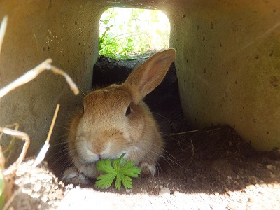 ウサギ小屋では、チャチャが、暑さを避けて日陰で涼んでいます。