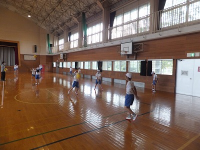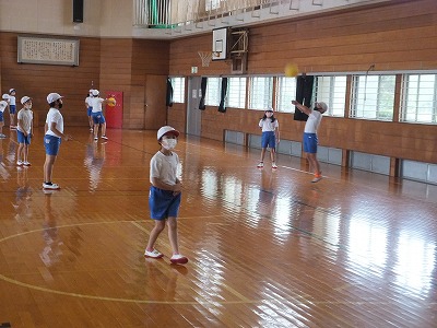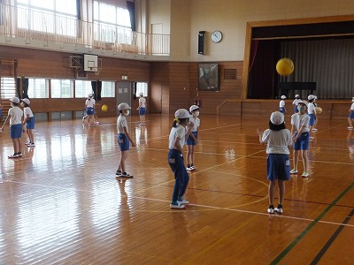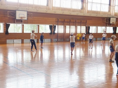 距離を取りながらグループで、バレーボールの練習をしました。