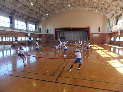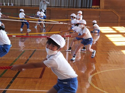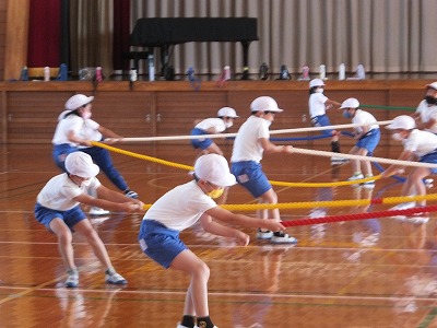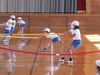 体つくりの運動をしました。今日は、短い綱引きです。