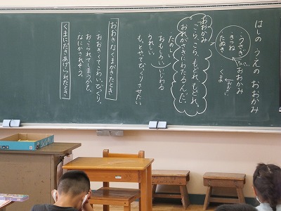 この話は、一本橋の上を次々と渡ってくる自分より小さくて弱い動物たちを困らせておもしろがっていたおおかみが,自分より大きくて強いくまに親切にされて,自分の行為を振り返り,親切にするよさに気付き,行いを改めるという話である。