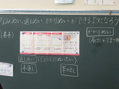 今日の家庭科は、波縫いやかがり縫い、返し縫の練習をしました。今日も、ボランティアの皆さんにお手伝いいただきました。