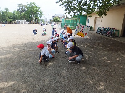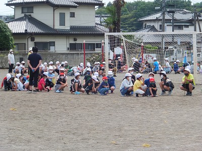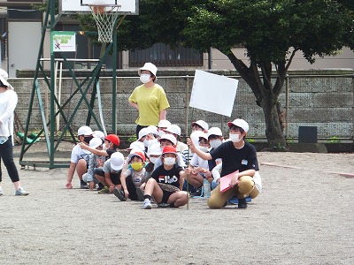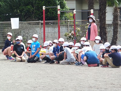 歩く時の並び方を確認し、できた班は座っています。例年なら手つなぎ遠足ですが、今年は、感染症予防のため、手はつなぎません。