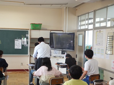見学に来た3年生には、6年生が説明しています。