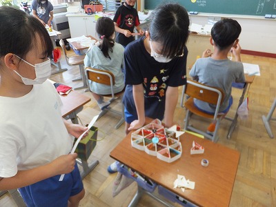点を中心に、図形の拡大図や縮図をかく練習をしています。